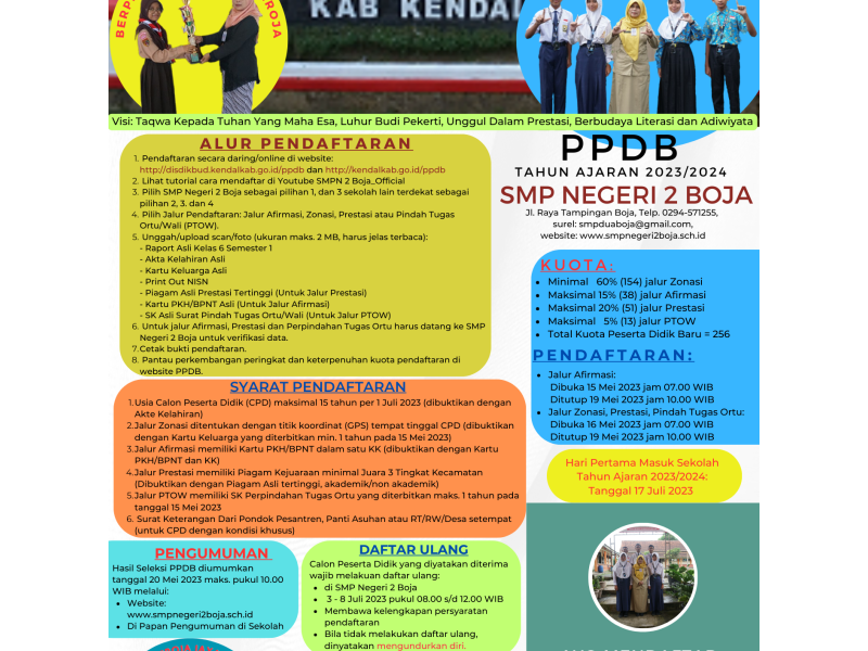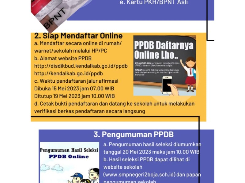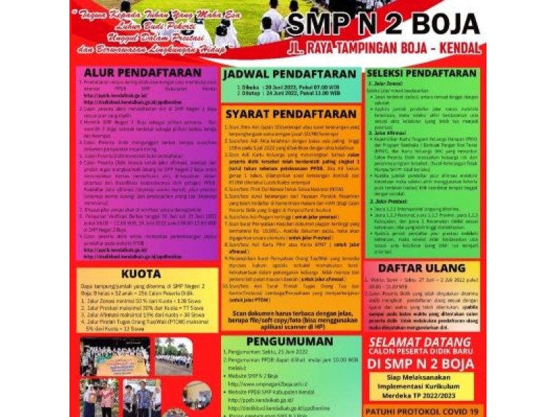 Terkait salah satu agenda pendidikan SMP Negeri 2 Boja yaitu PPDB (Penerimaan Peserta Didik Baru) tahun Ajaran 2023/2024, SMP Negeri 2 Boja memberikan informasi PPDB berupa flyer Informasi PPDB yang kami sebarkan salah satunya melalui website resmi SMP Negeri 2...